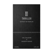 III Thriller ist ein neuer orientalischer, holziger Unisex-Duft aus dem Jahr 2026. Er eröffnet mit Pfeffer, Bergamotte, Kardamom, Zitrone, Safran und Elemi, geht über in Leder, Tonkabohne, Labdanum, Weihrauch und Muskatellersalbei und klingt mit Sandelholz, Vanille, Benzoeharz, Amber, Cashmeran und Moschus aus.